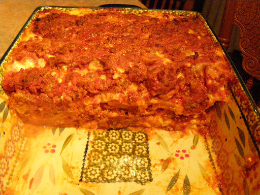 Layer half the noodles in a 13 x 9 pan at least 3 deep. Spread half the egg/cheese mix over noodles, top with half the sliced cheese, top that with half of the meat mixture. Repeat so you have 2 layers.