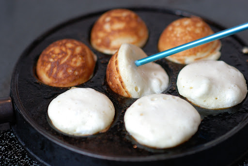 6. The Aebleskiver pan should be lightly greased and hot, then fill each opening ½ full with batter.