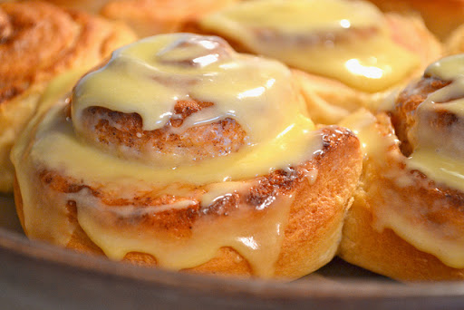 Pull the rolls out of the oven when they're golden brown, and drizzle on the icing right off the bat. The piping hot rolls will suck that gorgeous icing right down into their crevices and the whole thing pretty much becomes a miracle. Serve them warm.