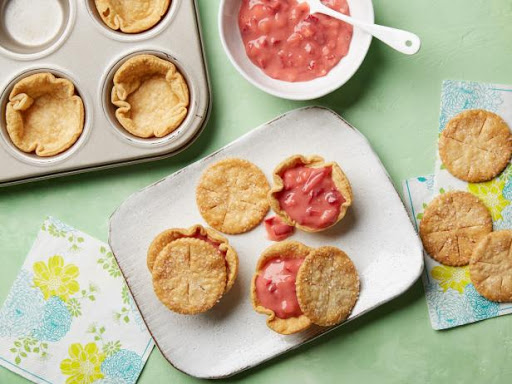 Remove the pie crust cups from the muffin tin. Spoon the strawberry filling into the cups and top with the fluted rounds and whipped cream.