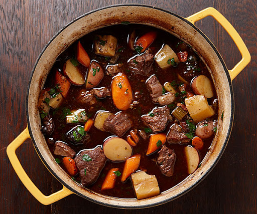 If the stew is still too liquidy, remove a cup of cooking liquid from the pan and stir in the flour. Add the flour mixture back into the pan and stir. Simmer for 10 minutes until the stew is thick. The meat should be very tender; if it's tough, let it continue to cook.