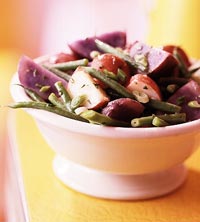 1. Scrub potatoes with a stiff brush under running water. Cut potatoes in quarters. In a Dutch oven cook potatoes in a small amount of boiling, lightly salted water, covered, for 10 to 15 minutes or until tender. Add beans the last 3 to 5 minutes of cooking. Drain; rinse with cold water until vegetables are cooled. Drain.