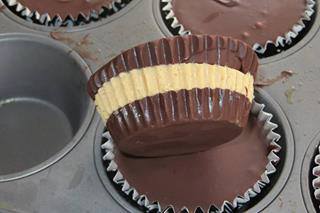 Line a muffin tin with cupcake papers. Spoon a small amount (about 2 teaspoons) of chocolate into the bottom of each paper. Tap the pan on your counter top to help smooth and spread the chocolate. Place the pan in the freezer for 15 minutes to harden the chocolate. Meanwhile, prepare the peanut butter.