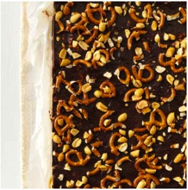 Sprinkle with peanuts and reserved pretzels; press down gently. Cover and refrigerate 30 minutes or until set. Cut into bars. Store in airtight containers. Yield: 3 dozen.