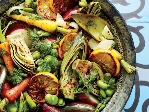 The olive oil emulsifies with the braising liquid to create a silky sauce that deliciously coats the bright spring veggies. Thin lemon slices, charred and caramelized in a cast-iron pan, make a nice garnish.