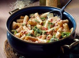 Cook and drain rigatoni as directed on package. Stir rigatoni and vegetables into chicken mixture; cook until hot. Serve with cheese.