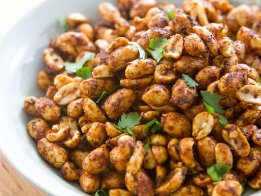 Spread the spiced peanuts on the prepared baking pan in a single layer. Bake until dry and a shade darker, about 15 minutes. Cool completely before adding the cilantro.