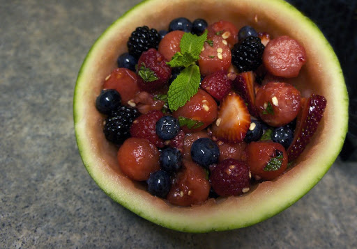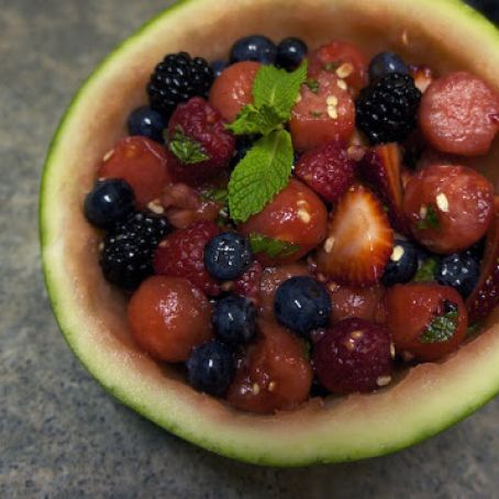 In a large bowl, combine the berries and watermelon. Pour the mint-lime syrup over the fruit and gently toss. Transfer to the watermelon bowls and serve.