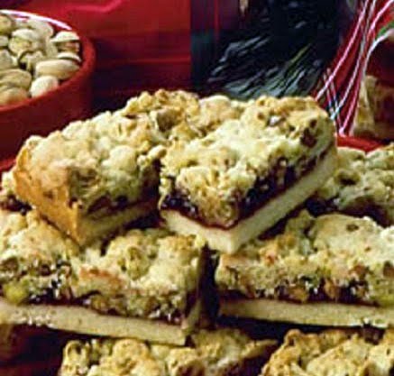 Spread jam to within 1/2 inch of edge. Add pistachios to remaining dough. Drop by spoonfuls over jam to cover. Bake 35 minutes until top is golden brown; cool. Cut into squares.