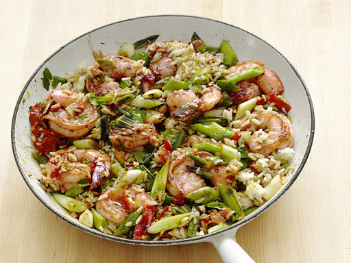 Add the tomatoes and scallions to the skillet and cook, stirring, about 1 minute. Add the rice and 1/4 cup water and continue to cook until the rice is warmed through and the shrimp are opaque, about 3 more minutes. Stir in the parsley and serve with lemon, if desired.