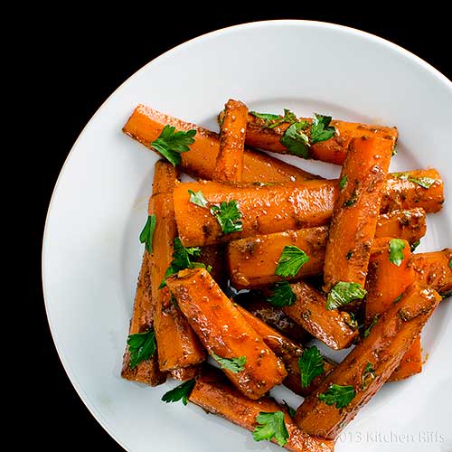 Scrub and peel the carrots, then cut them into dice of about ½ inch, or sticks measuring about 3 inches by ½ inch. Steam (or boil) carrots until just tender — usually 6 to 8 minutes.