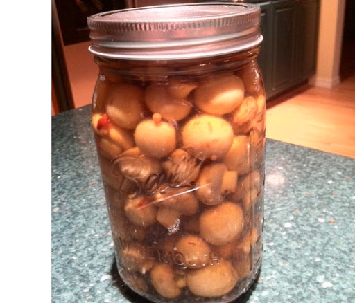 Wash mushrooms and place in saucepan. Cover with water and boil for 20 minutes. Drain and return to saucepan . Cover. With vinegar and add seasonings. Return to boil. Take of heat and put into jars.