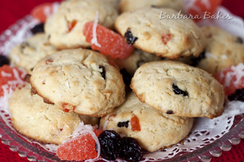 With bits of dried cherries, orange candies and coconut in each bite, these cookies won’t last long in thee cookie jar! Butter and sour cream make a rich dough.