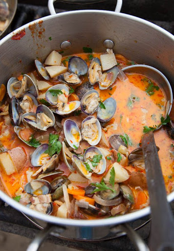When ready to serve, cook the clams. Working in batches, place enough clams to fill but not crowd the bottom of a heavy-bottomed sauté pan over medium heat. Ladle 1 cup of the chowder base on top and cover the pan. Simmer for about 4 minutes, or until the majority of clams open. Pick out any clams that have not opened. Transfer cooked clams to the pot with the chowder base, and continue cooking in batches until clams are all cooked.