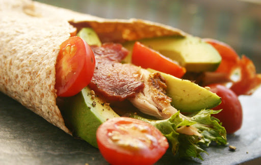 Shake the vinaigrette ingredients in a jar. Toss the greens with the vinaigrette, and then stuff the greens and all other wrap ingredients into the tortillas. Sprinkle with salt and pepper.