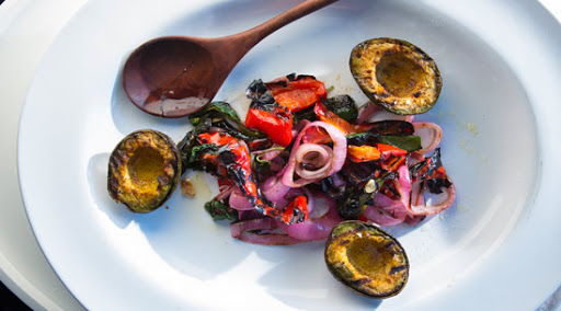 3. Rub the cut side of the avocados with the remaining 1 tablespoon of olive oil, season with the remaining ¾ teaspoon of salt and sprinkle with the chile powder. Grill the avocados cut side down until they are gently warmed and grill-marked, about 3 minutes. Serve with the pepper salad, salt and pepper to taste and bread, if using.