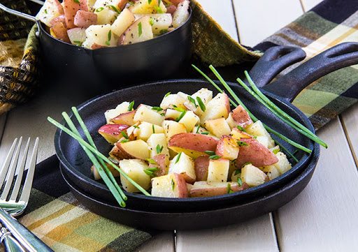 2.Tear off a large sheet of aluminum foil, about 14 inches in length. Place the diced potatoes and chopped chives in the center of the foil. Fold up the sides of the foil to create a square ’bowl’ containing the potatoes. Drizzle olive oil over the potatoes. Season well with salt and pepper. Match up the ends of the foil and fold over to create an air-tight packet. Packet must be firmly sealed so that oil does not seep from the packet during grilling.