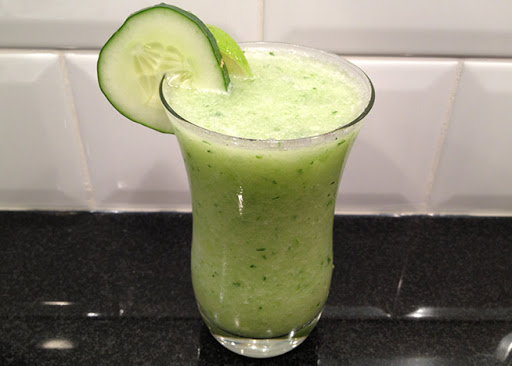 5.) Blend until smooth, about 60 – 90 seconds then pour into glass and garnish with slice of cucumber and lime.