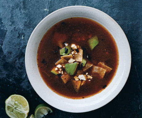 Tortilla soup is all about contrasting textures, but its real success hinges on a fabulous broth—in this case, homemade chicken stock enriched with a cooked purée of chiles, tomatoes, onion, and garlic.