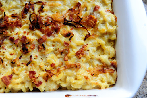 Add cheeses and stir until melted. Add onions and bacon and stir. Taste for seasonings and add more salt if needed. Add cooked macaroni and stir to coat.