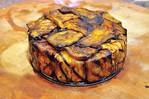 Fold the side pieces over the top and add the extra pieces of eggplant, and bake for 30 minutes, until everything is cooked through. Let sit for at least 10 minutes -- otherwise you'll just crush/smash/ruin the shape. Then use a very sharp knife to cut it into wedges.