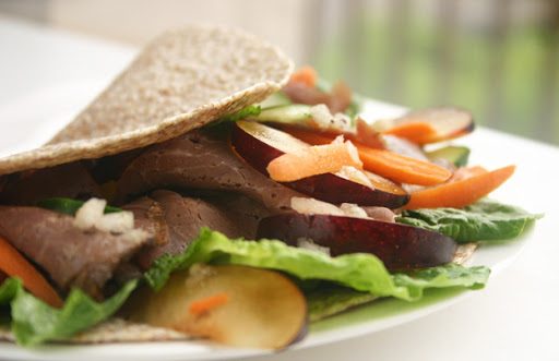 Fill the tortillas with lettuce, roast beef, plums, cucumbers, carrots, and mint. Serve with the vinaigrette for drizzling or dipping.
