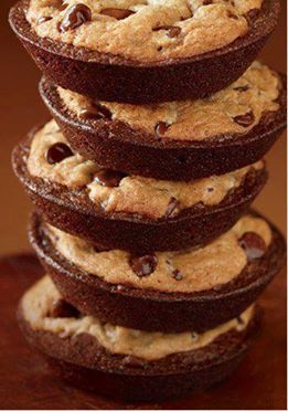 Make brownie and cookie mixes according to box directions, put brownie mix in each well of your pan then drop cookie dough on top. Bake as directed on box BUT start checking about half way through the directed time so your brownies stay moist (remember they are a smaller cook area when made as a muffin size and it will vary a little for each oven)