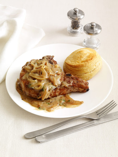 Add the buttermilk and return the chops to the skillet. Bring the sauce to a simmer, then reduce the heat to medium low and cook until the sauce is thickened and the chops are just cooked through, 10 to 12 minutes. Serve with biscuits.