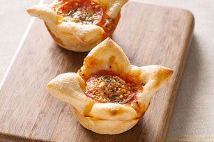 UNROLL pizza dough on cutting board. Cut into 12 (3x2-inch) rectangles; place 1 in each of 12 muffin pan cups sprayed with cooking spray.