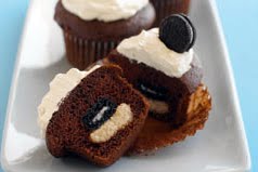 3) Spoon half the cake batter into 24 paper-lined muffin cups. Top each with about 1-1/2 tsp. cream cheese mixture and 1 cookie; cover with remaining cake batter.