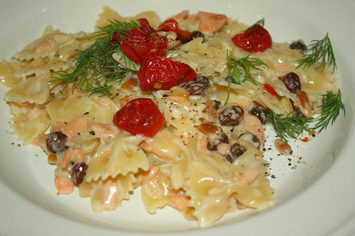 This sauce takes less than 10 minutes to cook, so remember it when cooking your pasta (I usually start to cook the sauce once I've added the pasta to the boiling water). Melt together the butter and oil in a shallow pan which should be on a medium heat. Add the whole garlic cloves and sauté them in the oil for two minutes, taking care not to burn. Remove the garlic from the oil and discard. Add the pine nuts and the raisins and cook for a further minute. Add the salmon and the tomatoes and cook for two minutes - the salmon should start to change color. Add the cream and nutmeg and simmer gently for about 2 minutes. Season with salt and pepper. Drain your pasta and stir it into the pan containing the sauce, cook for a further minute. Garnish with the wild fennel (or dill).