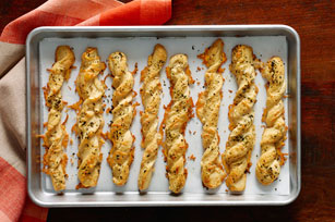 PLACE strips, 1 inch apart, on parchment-covered rimmed baking sheet. Hold both ends of 1 strip, then turn ends in opposite directions to form twist. Repeat with remaining dough strips. Brush with butter; sprinkle with remaining ingredients.
