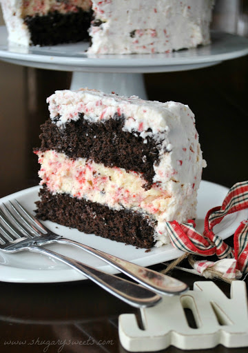 To assemble the cake, lay one frozen layer of chocolate cake on cake plate. Top with frozen cheesecake and second layer of chocolate cake. Frost sides and top with a thin layer of frosting to apply a crumb coat. Refrigerate 30 minutes to an hour. Remove from refrigerator and frost remaining cake. I keep the cake covered in the refrigerator until ready to eat. Remove and allow to sit about 15 minutes before slicing. ENJOY!