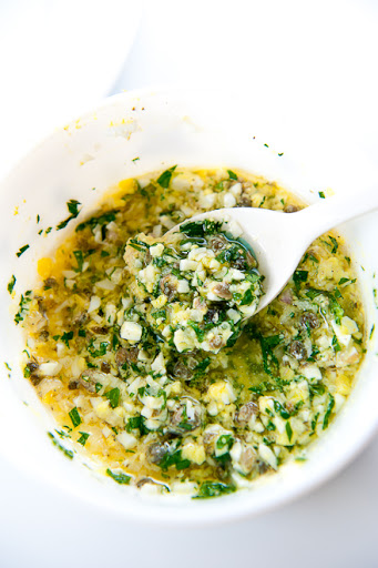 Place the mustard, red wine vinegar, lemon juice, shallot, cornichons, capers, chopped egg in a bowl and whisk in the olive oil. Season with salt and pepper to taste and add the chopped herbs at the last moment.