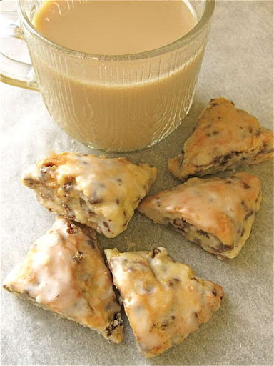 I baked a batch of these scones this afternoon, and they were terrific. It's such a simple and versatile recipe. Since I wasn't in the mood for chocolate chips and its winter time, I decided to make cinnamon and raisin scones. I simply added 1 tablespoon of cinnamon and 1 1/4 cup of raisins to my dry ingredients. I also substituted heavy whipping cream for the milk. Before I popped these into the oven, I also brushed a thin layer of the cream on top of each scone. When I made the glaze I used only 3 cups of power sugar and added a half cup of light brown sugar. The perfect winter time treat.