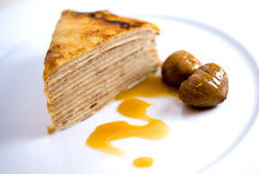 Lay 1 crêpe on a cake plate. Using an icing spatula, completely cover with a thin layer of chestnut cream. Cover with a crêpe and repeat to make a stack of 15 to 20.