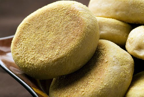 Sprinkle waxed paper with cornmeal and set the rounds on this to rise. Dust tops of muffins with cornmeal also. Cover and let rise 1/2 hour.