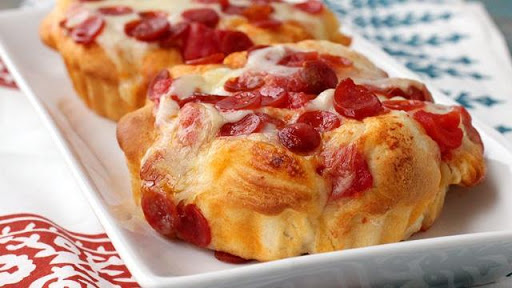 In large bowl, mix tomatoes, sugar, salt and Italian seasoning. Spoon equal amounts of tomato mixture on top of biscuit pieces in each pan. Top each with slice of cheese and 1/4 cup pepperoni.