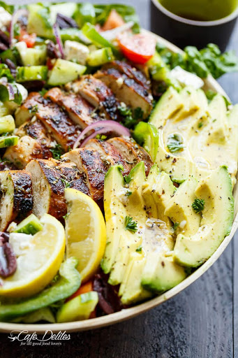 Loaded Greek Chicken Avocado Salad is another meal in a salad! Full of Greek flavours and a 5-ingredient dressing that doubles as a marinade!