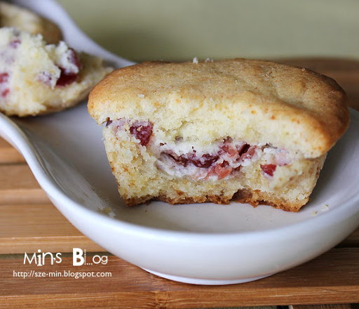 把一些面糊放入烤杯/烤杯, 加入奶油乳酪馅, 然后再盖上面糊。