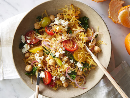 Spaghetti squash is a great lower-calorie, lower-carb alternative to pasta. It’s a neutral tasting veggie that absorbs all the flavors of this simple skillet, so be sure to toss well to coat every strand. The end result is a veggie-based meal in a bowl that you can quickly throw together—a nice alternative to salads when you want to fill up on vegetables.