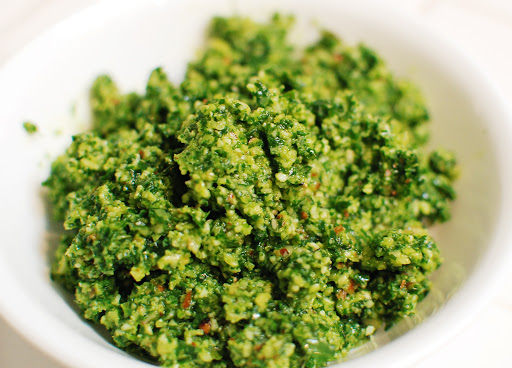 Combine the basil, garlic, and pine nuts in a food processor and pulse until coarsely chopped. Add 1/2 cup of the oil and process until fully incorporated and smooth. Season with salt and pepper.