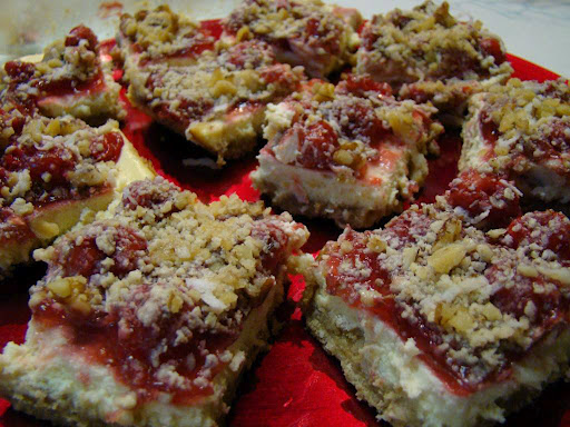 Combine cream cheese, sugar, eggs and vanilla in a small bowl. Beat at medium speed until well blended. Spread over hot baked base. Return to oven. Bake 15 minutes. Do not over bake. Spread cherry pie filling over cream cheese. Combine reserved coarsely chopped nuts and reserved crumbs. Sprinkle over pie filling. Return to oven. Bake for 15minutes. Do not over bake. Cool in pan. Refrigerate several hours. Cut into bars.