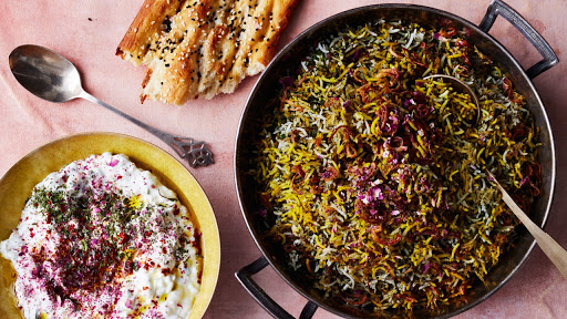Scoop 1½ cups rice into reserved saffron water and toss to color rice. Layer saffron rice with rice in pot, reserved herbs, and crispy shallots. Top with rose petals if using. Break up lavash crust into pieces and serve alongside rice.