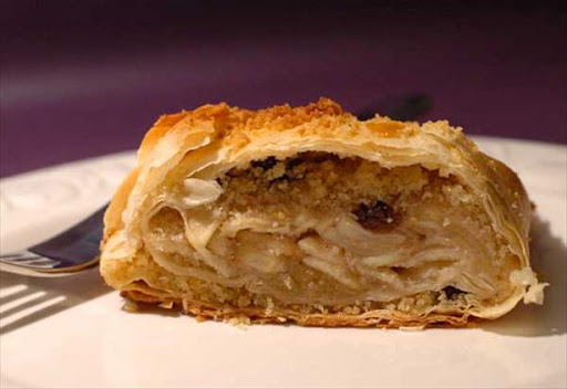 Bake for 30 minutes, until golden brown. Pour over the glaze and sprinkle with cinnamon and confectioners' sugar. Pass warm caramel sauce, to drizzle over the strudel.