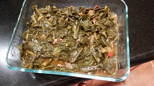 Brown bacon, country ham chips; then add onion and saute. Dissolve ham base in chicken broth, then add remaining ingredients except collards and bring to a med-high boil.