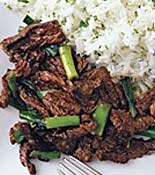 5. Stir the cilantro into the rice; season with salt. Mound some rice and beef onto each plate.