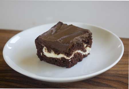 Grease and flour 13x9” pan. In small bowl blend all filling ingredients; beat at highest speed until smooth and creamy. Set aside. In large bowl blend cake mix, water, oil and eggs until moistened. Beat 2 minutes at highest speed. Pour half of batter into prepared pan. Pour cream cheese mixture over batter, spreading to cover. Pour remaining batter over cream cheese mixture.