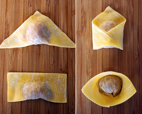 * a. One easy way to wrap is to form a triangle by folding the bottom tip to the top tip and pinching out as much air as possible. Add a dab of egg wash to the inside of the left tip, fold it over the right tip to overlap (as shown in the picture above) and press together.