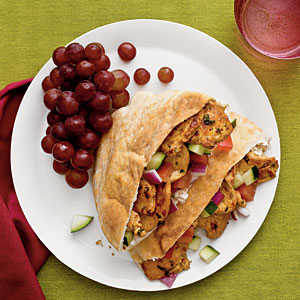 This chicken shawarma is a Middle Eastern version of a gyro and feautures thin slices of chicken mixed with yogurt and wrapped in pita bread spread with tahini. The sandwiches are then topped with fresh cucumber, tomato and onion.